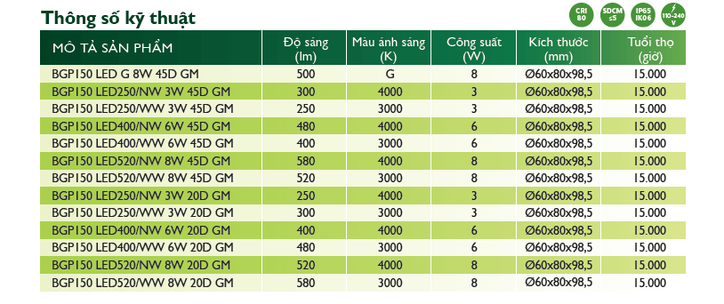 | Thông số kỹ thuật đèn Led Philips chiếu sáng cảnh quan Ess SmartBright Spotlight BGP150 LED520/NW 8W 20D GM |