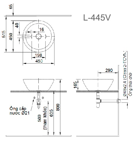 - Bản vẽ kỹ thuật chi tiết dùng để lắp đặt chậu rửa đặt bàn INAX L-445V