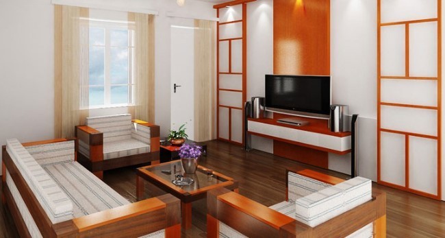 Với không gian phòng khách khá khiêm tốn thì một bộ bàn ghế có kiểu dáng nguyên khối gỗ hoặc kiểu đơn giản đi kèm với những màu sắc trang nhã như: màu trắng, nâu sáng... giúp cho không gian phòng khách trở nên thoáng đãng hơn, thuận tiện cho việc vệ sinh và lau chùi.